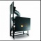 Caminetto monoblocco a legna con porta saliscendi ad aria calda ventilata con radiocomando KW 8,9 + Rivestimento India in pietra di Vicenza spazzolata con trattamento protettivo.Cornice circolare in marmo nero assoluto fiammato e spazzolato. |
